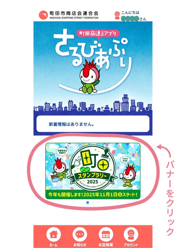 ①トップページの「町田わくわくスタンプラリー2025」のバナーをクリックします。